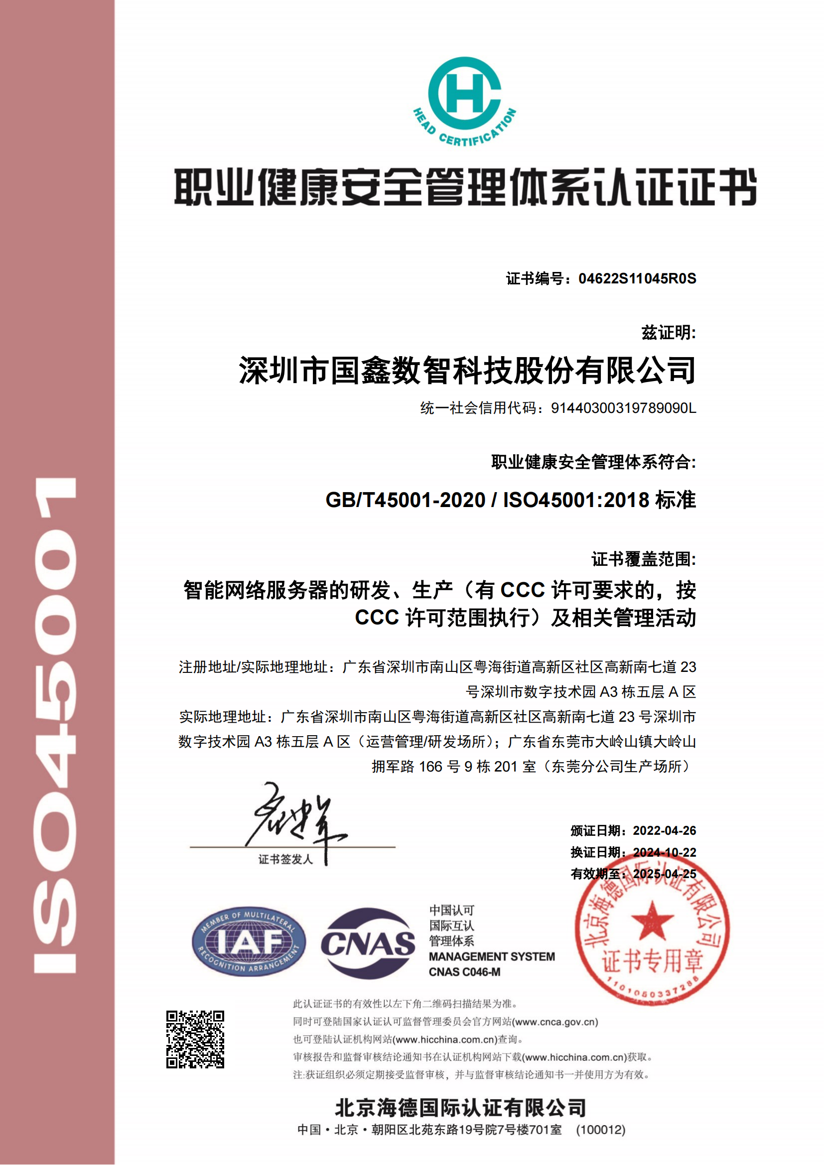 ISO45001职业健康安全证书